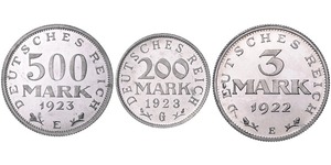Ersatz- und Inflationsmünzen 1919-1923. Lot von 3 Stücken: 3 Mark 1922 E Verfassungstag | 200 Mark 1923 G | 500 Mark 192 ...