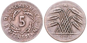 5 Rentenpfennig 1924 A geprägt auf 1 Pfennig Schrötling (J.306). Jaeger zu 308. 2,00 g. f.ss ...