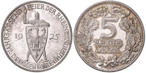 5 Reichsmark 1925 A Zur Jahrtausendfeier der Rheinlande. Jaeger 322. Patina. st ...