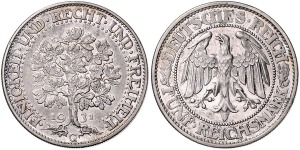 5 Reichsmark 1931 G Eichbaum, Erstabschlag. Jaeger 331. Prachtexemplar. vz-st ...
