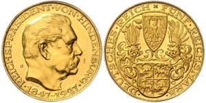 5 Reichsmark Probe in Gold (!) auf den 80. Geburtstag des Reichspräsidenten Hindenburg, Portraitseite im Halsabschnitt K ...