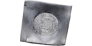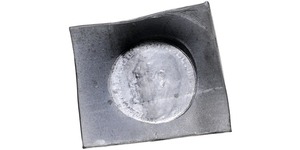 Bleiabschlag auf viereckiger Klippe der Wappenseite der Goldmarkprobe von Karl Goetz in 10 Markgröße 1928, auf den 80. G ...