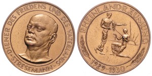 Bronzemedaille 1930 (v. Glöckler) auf Gustav Stresemann und die Rheinlandräumung 1929-1930, i.Rd: PREUSS. STAATSMÜNZE. 3 ...