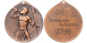 Bronzemedaille 1930 (v. M.&W.) auf die Rheinlandräumung. mitgeprägte Öse 32,7 mm, 15,92 g. vz ...