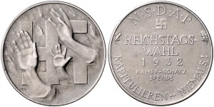 Silbermedaille 1932 NSDAP Kampf-Schatz Spende zur Reichstagswahl, i.Rd: 990. mattiert 35,4 mm, 19,96 g. vz ...