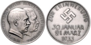 Silbermedaille 1933 (v. Hörnlein) Hitler u. Hindenburg / Zur Erinnerung 30. Januar - 21. März, i.Rd: SÄCHS. MÜNZE 999 f. ...