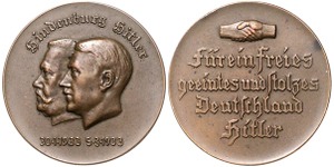 Bronzemedaille 1933 (unsign.) Köpfe von Hindenburg und Hitler / Für ein freies - geeintes und stolzes - Deutschland - Hi ...