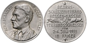 Zinkgussmedaille 1933 (unsign.) auf das 34. Verbandsschießen des Bezirksschützenverbandes Hessen-Nassau in Haiger. C/H C ...