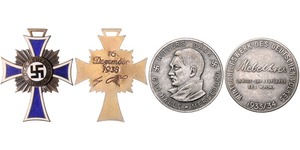 Lot von 2 Stücken: Ehrenkreuz der Deutschen Mutter in Bronze, gestiftet 16. Dez. 1937 durch A. Hitler (teilemailliert, m ...