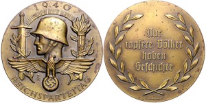 Vergoldete Bronzemedaille 1940 (v. Klein/Deschler) Reichsparteitag / Nur tapfere Völker haben Geschichte. Patinaflecken, ...