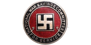 Emaillierter Anstecker des NATIONAL WAR SAVINGS COMMITTEE / FOR SERVICE, rückseitig Hersteller: Thomas Fattorini, Birmin ...