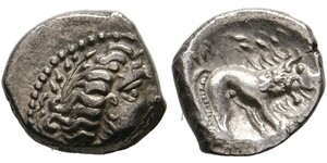 Drachme (1,83g) ca. 2. Jhdt. v. Chr. Insubres, Typus "Toutiopouos", Stilisierter Kopf der Artemis / Stilisierter Löwe, d ...