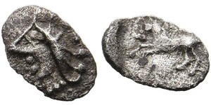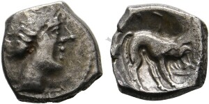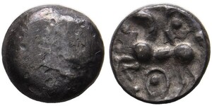 Kleinsilber / "Obol" (0,41g) Stilisierter Kopf mit Stachelhaar / Stilisiertes Pferd, darüber Punkte (außerhalb des Schrö ...