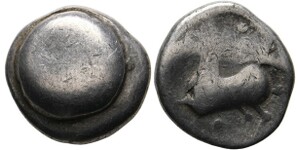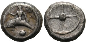 Didrachme / Nomos (7,42g) ca. 480-470 v. Chr. Taras auf Delphin, unten Muschel / Vierspeichiges Rad mit einem Delphin. V ...