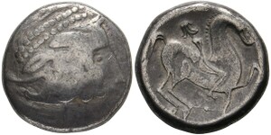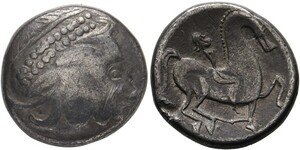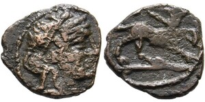 As (8,78g) ca. 140-100 v. Chr. Bärtiger Kopf, dahinter Delphin / Reiter mit Lanze, dahinter Stern. ACIP 1419. Auflagen u ...