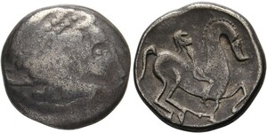 Tetradrachme (14,17g) Philippos II.-Imitation Stilisierter Kopf des Zeus mit Lorbeerkranz / Stilisierter Reiter, umgeben ...