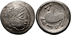 Tetradrachme (10,71g) Typus "Buckelavers" (Cotini?) Buckel / Stilisiertes Pferd, umgeben von Kugeln; unten Spitze eines ...