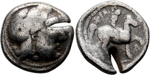 Tetradrachme (Dickschrötling) (11,65g) Typus "Apollokopf" Kopf des Apollon / Stilisierter Reiter. OTA 232, Dembski 1130. ...