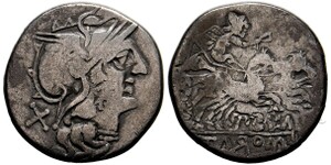 Denarius (3,86g) Stilisierter Kopf der Roma mit geflügeltem Greifenhelm, dahinter Wertzeichen X / Stilisierte Victoria m ...