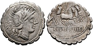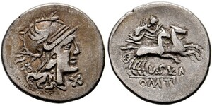 Denarius (3,86g) Stilisierter Kopf der Roma mit geflügeltem Greifenhelm / Stilisierter Wagenlenker in Quadriga. Mögliche ...