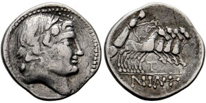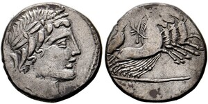 Denarius (3,84g) Stilisierter Kopf des Apollon mit Lorbeerkranz / Stilisierter Wagenlenker mit Kranz in Quadriga. Vorbil ...