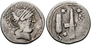 Denarius (3,56g) Stilisierter Kopf der Roma mit geflügeltem Greifenhelm / Fasces zwischen Ähre und Caduceus, in den Feld ...