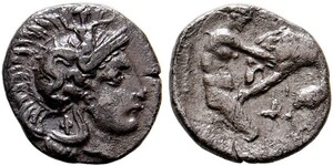 Diobol (1,02g) ca. 380-325 v. Chr. Kopf der Athena mit attischem Helm, auf dem Helmkessel Skylla, auf dem Nackenschutz Φ ...