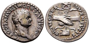 Denarius (2,98g) Roma, Anfang-Juni 79 n. Chr. Kopf mit Lorbeerkranz / Handschlag, dahinter Aquila auf Prora. RIC II² 108 ...