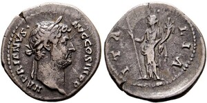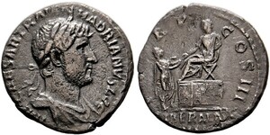 Denarius (2,63g) 120-121 n. Chr. Roma, Büste mit Lorbeerkranz und Drapierung / Kaiser auf Sella curulis, auf Daïs sitzen ...